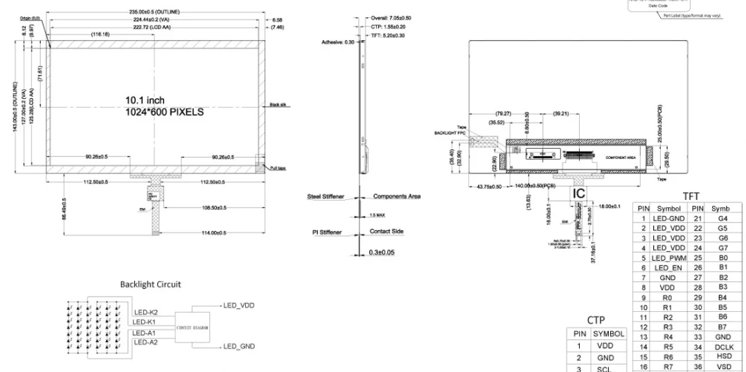 Yalnızca 235 mm × 143 mm × 7,05 mm'lik ince boyutları, onu kompakt cihazlar için uygun kılar. 3,3V ile çalışan ve 40 pinli FFC kablo (CTP için 6 pinli FFC) kullanan 10,1 inç endüstriyel PCAP dokunmatik ekran modülü, -20°C ila 70°C arasındaki sıcaklıklarda çalışır ve -30°C ila 80°C depolama sıcaklığı aralığına sahiptir ve zorlu ortamlarda bile güvenilir çalışma sağlar.